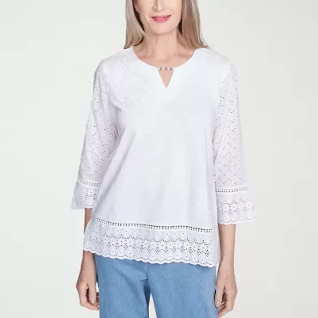 Alfred Dunner Natural Instinct Womens Split Crew Neck 3/4 Sleeve Embroidered Blouse
