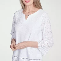 Alfred Dunner Natural Instinct Womens Split Crew Neck 3/4 Sleeve Embroidered Blouse