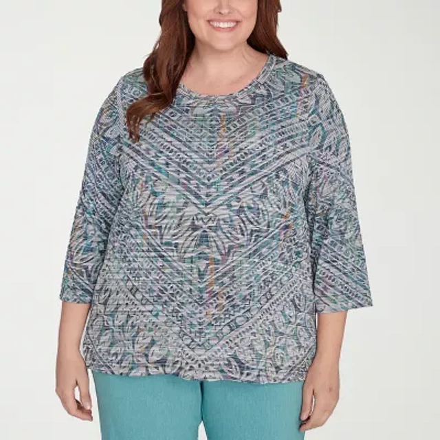 Alfred Dunner Lake Victoria Womens Plus Crew Neck 3/4 Sleeve T-Shirt