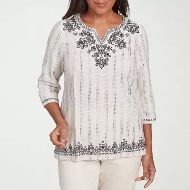 Alfred Dunner Natural Instinct Womens Split Crew Neck 3/4 Sleeve Embroidered Blouse