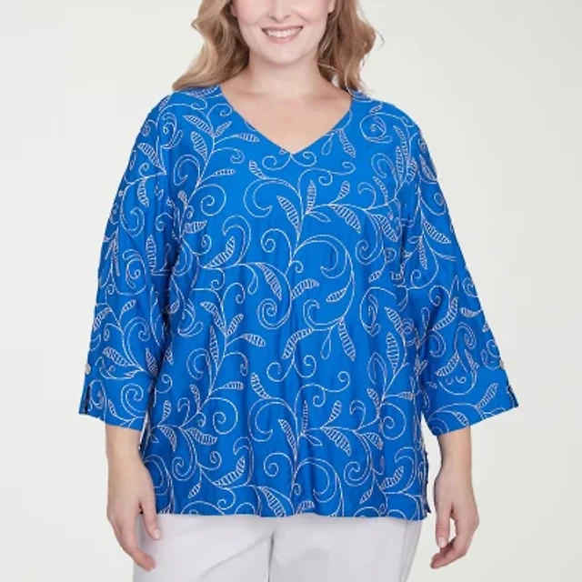 Alfred Dunner Parrot Cay Womens Plus V Neck 3/4 Sleeve Embroidered Blouse