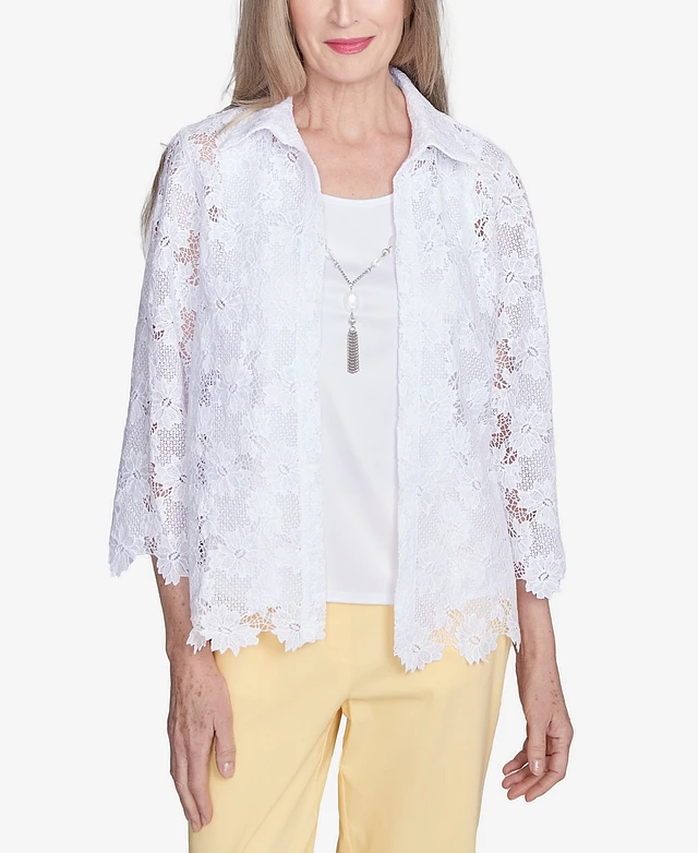 Alfred Dunner Petite Dress Code Two in One Lace Top with Necklace