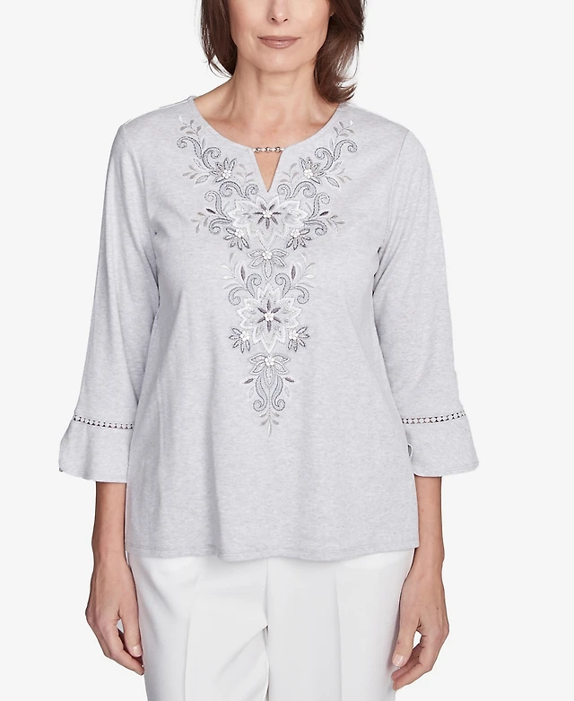 Alfred Dunner Petite Estate of Mind Embroidered Scroll Bell Sleeve Top