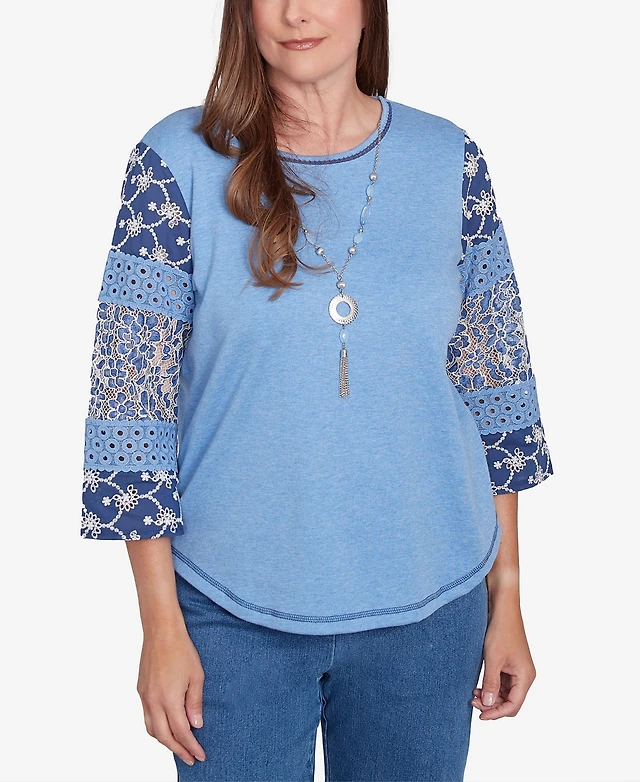 Alfred Dunner Petite Kensington Gardens Floral Lace Woven Trim Top with Necklace
