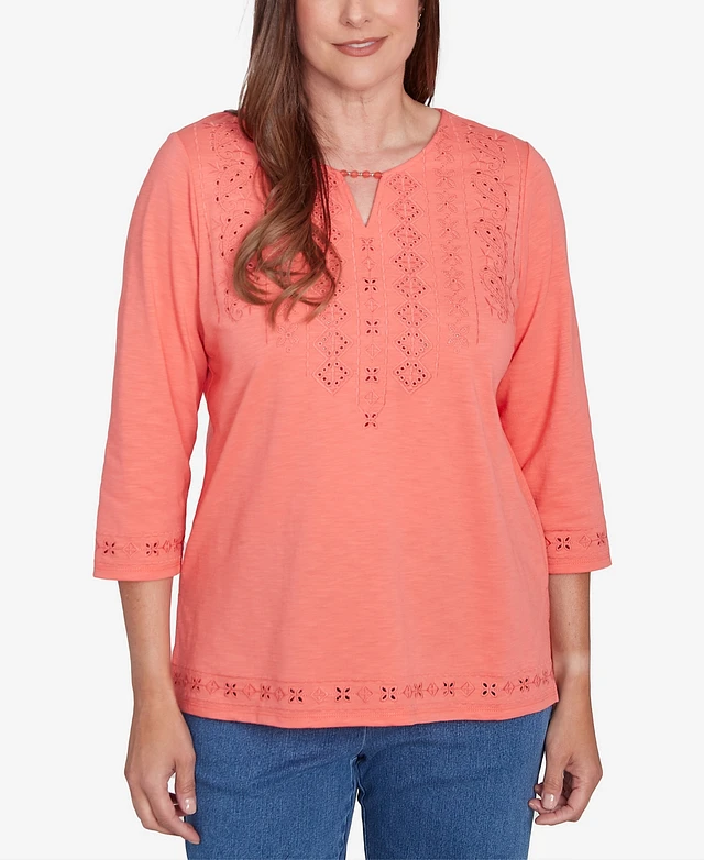 Alfred Dunner Petite Parrot Cay Solid Split Neck Lace Trim Top