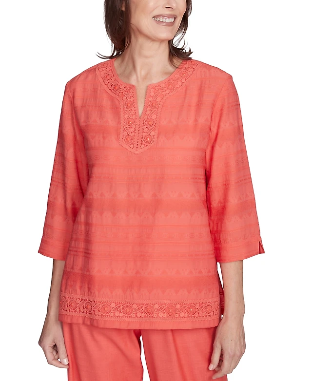 Alfred Dunner Petite Parrot Cay Solid Split Neck Lace Trim Top