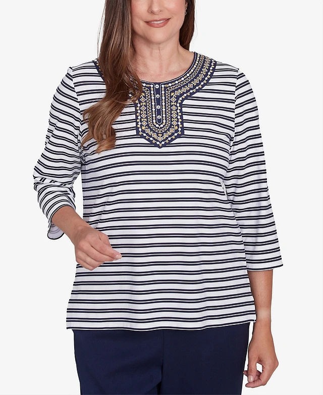 Alfred Dunner Petite Casual Vibe Embellished Striped Crew Neck Top