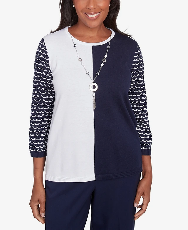Alfred Dunner Petite Striped Sleeve Colorblock Sweater with Necklace