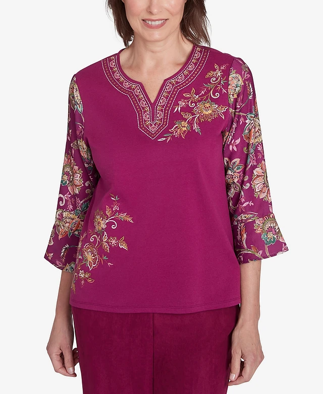 Alfred Dunner Petite Wine Country Embroidered Floral Sleeve Split Neck Top