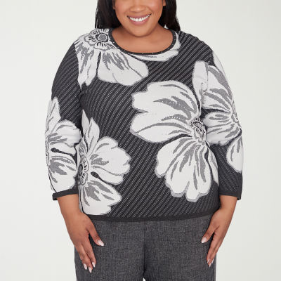 Alfred Dunner Plus Romancing The Stone Womens Crew Neck 3/4 Sleeve Floral Pullover Sweater