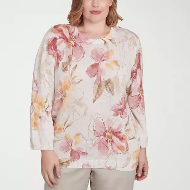 Alfred Dunner Plus Coming Up Roses Womens Crew Neck 3/4 Sleeve Floral Pullover Sweater