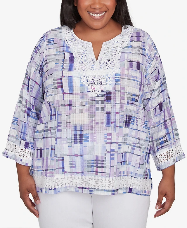 Alfred Dunner Plus Crystal Springs Watercolor Plaid Lace Neck Top