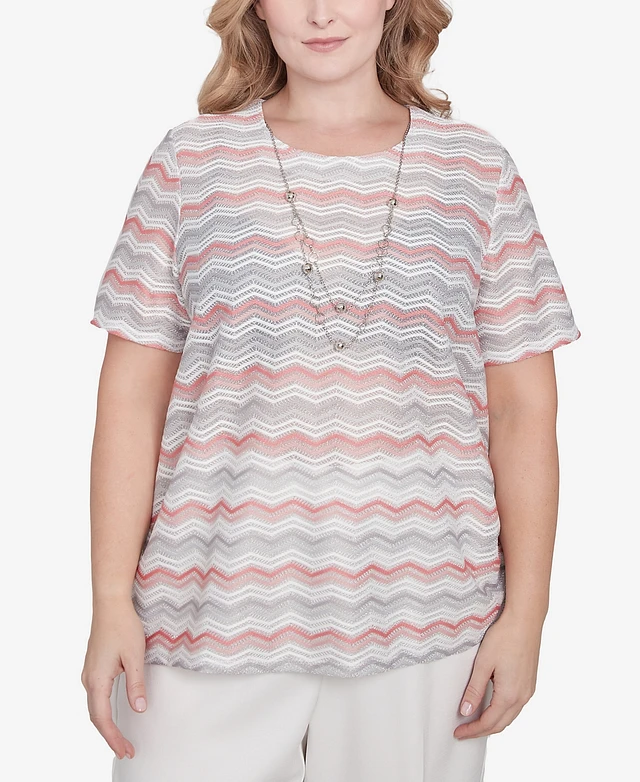 Alfred Dunner Plus Estate of Mind Chevron Shimmer Crew Neck T-Shirt with Necklace