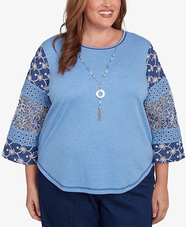 Alfred Dunner Plus Free Spirit Patchwork Sleeve Knit Top with Necklace