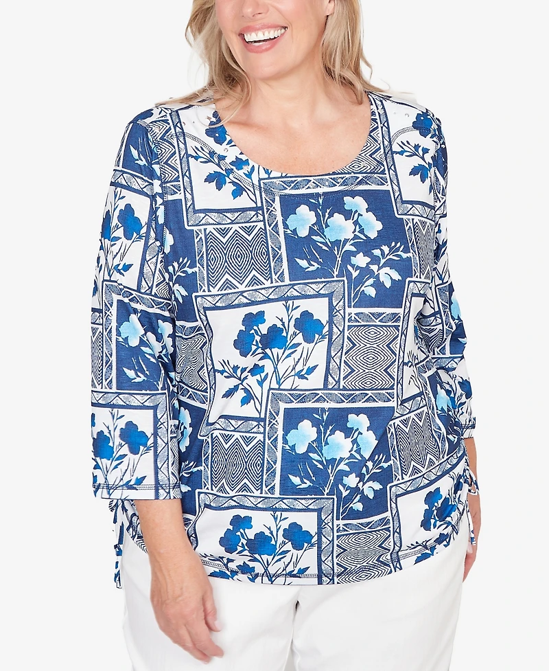 Alfred Dunner Plus Mykonos Framed Floral Ruched Side Tie Top