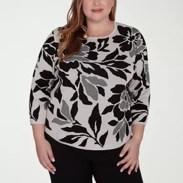 Alfred Dunner Plus Wild At Heart Womens Crew Neck 3/4 Sleeve Floral Pullover Sweater