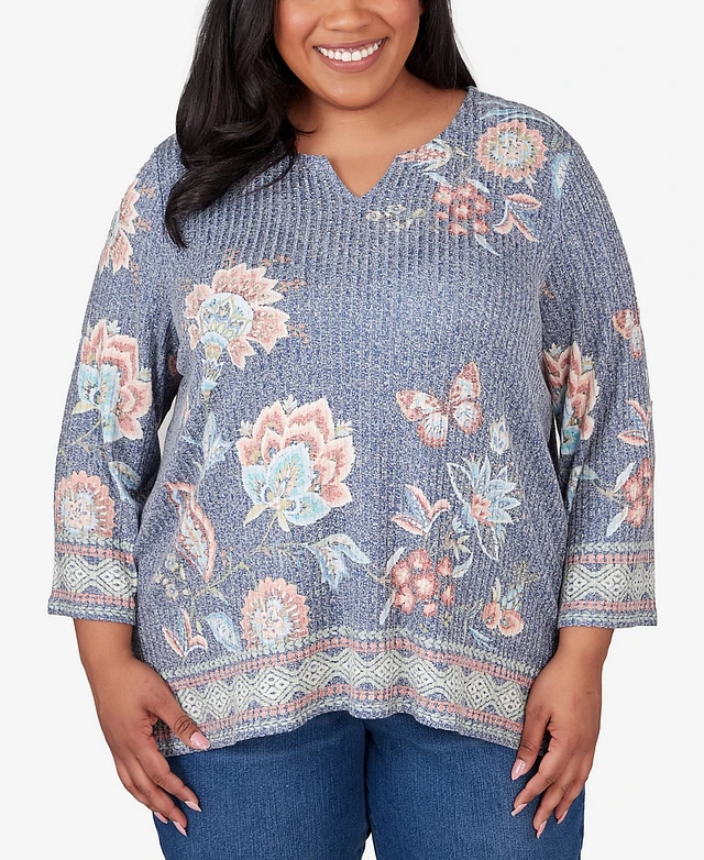Alfred Dunner Plus Scottsdale Floral Border Split Neck Top
