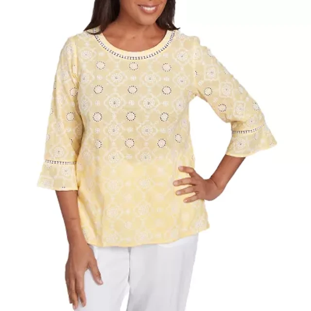 Alfred Dunner Rise And Shine Womens Crew Neck 3/4 Sleeve Embroidered Blouse