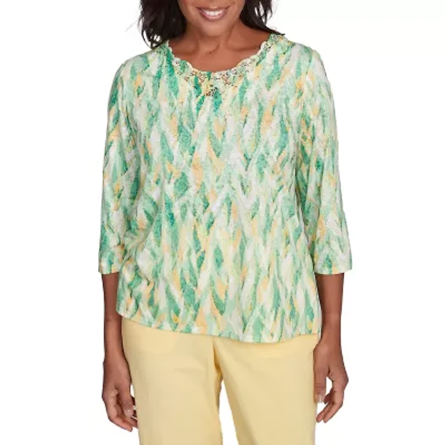 Alfred Dunner Rise And Shine Womens Split Crew Neck 3/4 Sleeve T-Shirt