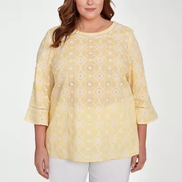 Alfred Dunner Rise And Shine Womens Plus Crew Neck 3/4 Sleeve Embroidered Blouse