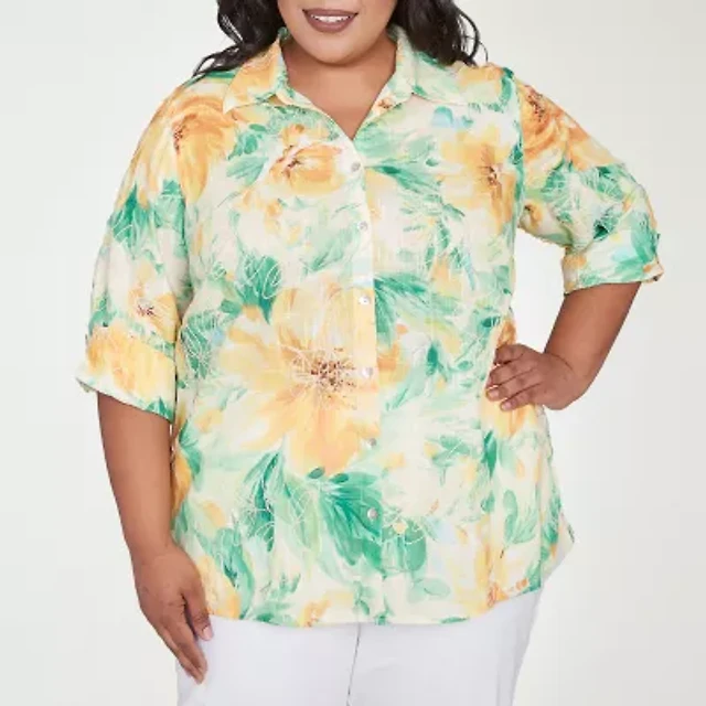 Alfred Dunner Rise And Shine Womens Plus Cuffed 3/4 Sleeve Button-Down Shirt