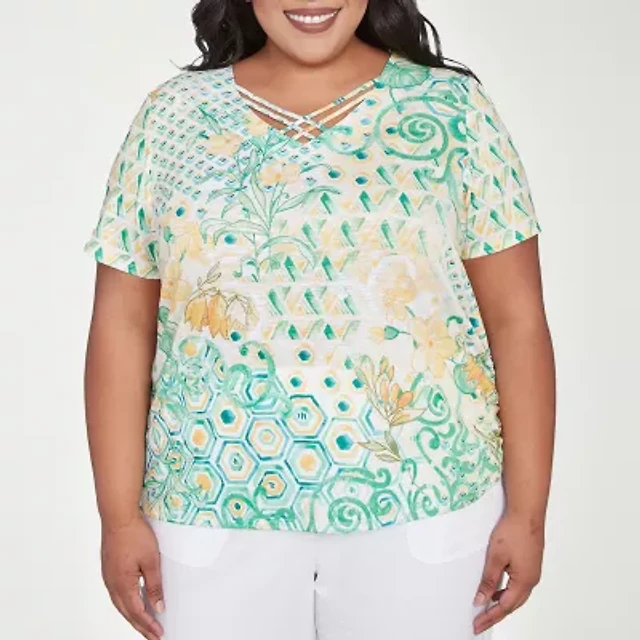 Alfred Dunner Rise And Shine Womens Plus V Neck Short Sleeve Stretch Fabric T-Shirt