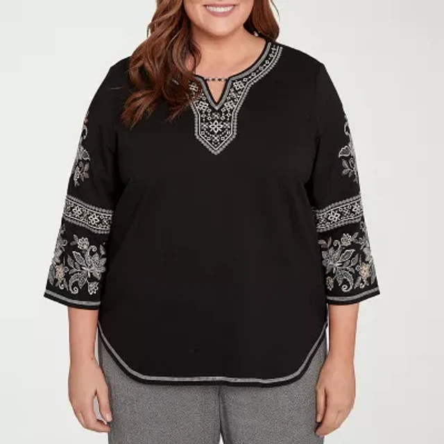 Alfred Dunner Santa Barbara Womens Split Crew Neck 3/4 Sleeve Plus T-Shirt