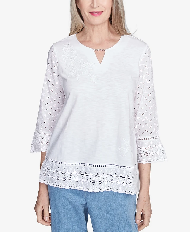 Alfred Dunner Women's Flower Power Floral Embroidered Eyelet Trim Top
