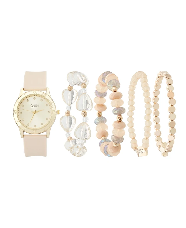 American Exchange Women's Beige Silicone Strap Analog Watch 35mm with Stackable Bracelets Gift Set