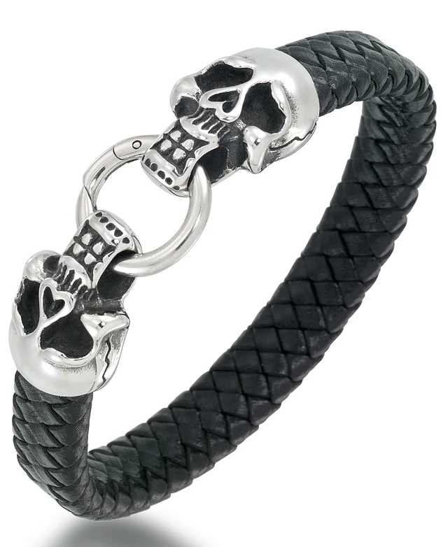 Andrew Charles by Andy Hilfiger Men's Leather Skull Head Bracelet in Stainless Steel