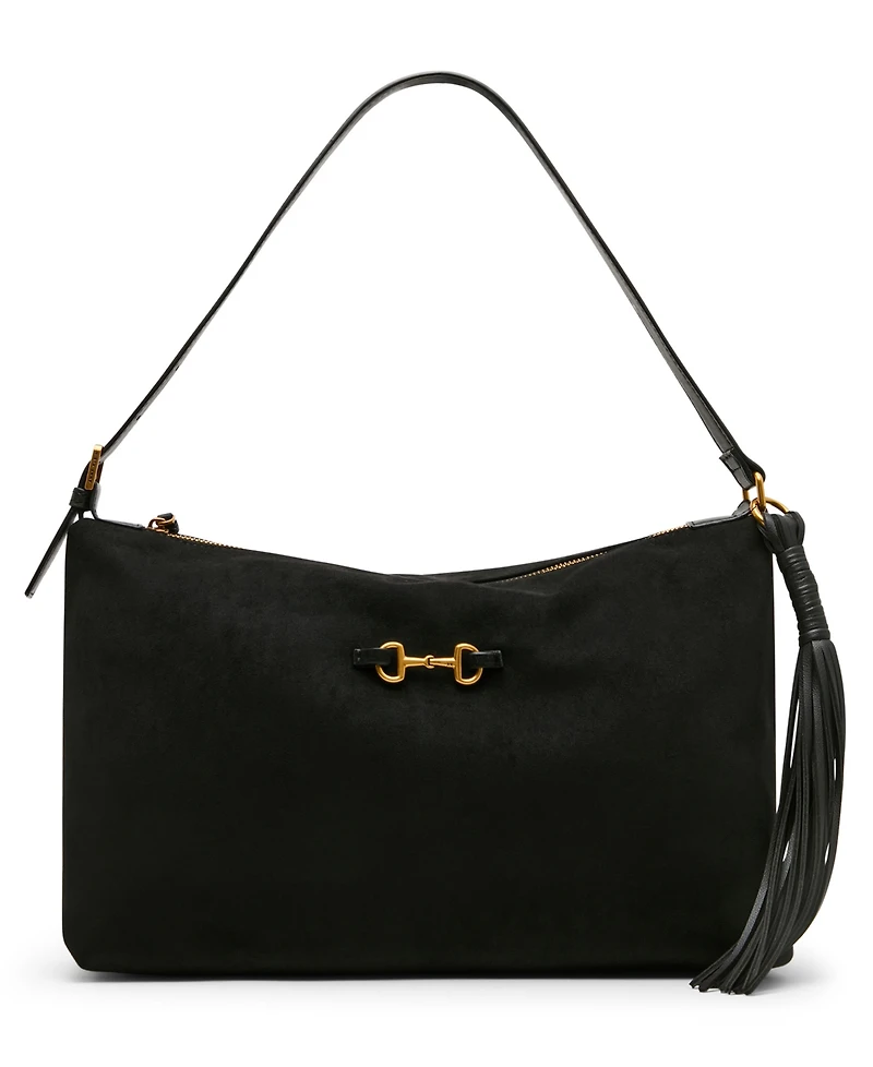 Elevate your style with this slouchy shoulder bag. Features a faux suede material and a new horse-bit detail and elongated tassel for that luxurious look.