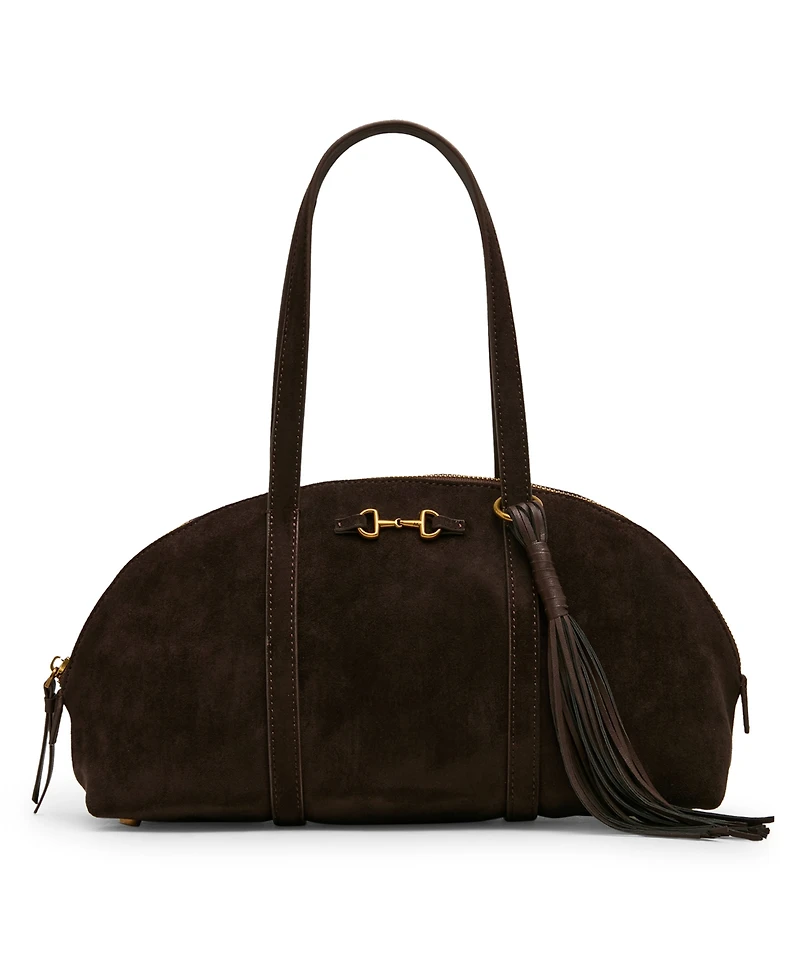 This bowler is the perfect every day bag. Features a faux suede material and a new horse-bit detail and elongated tassel for that luxurious look.