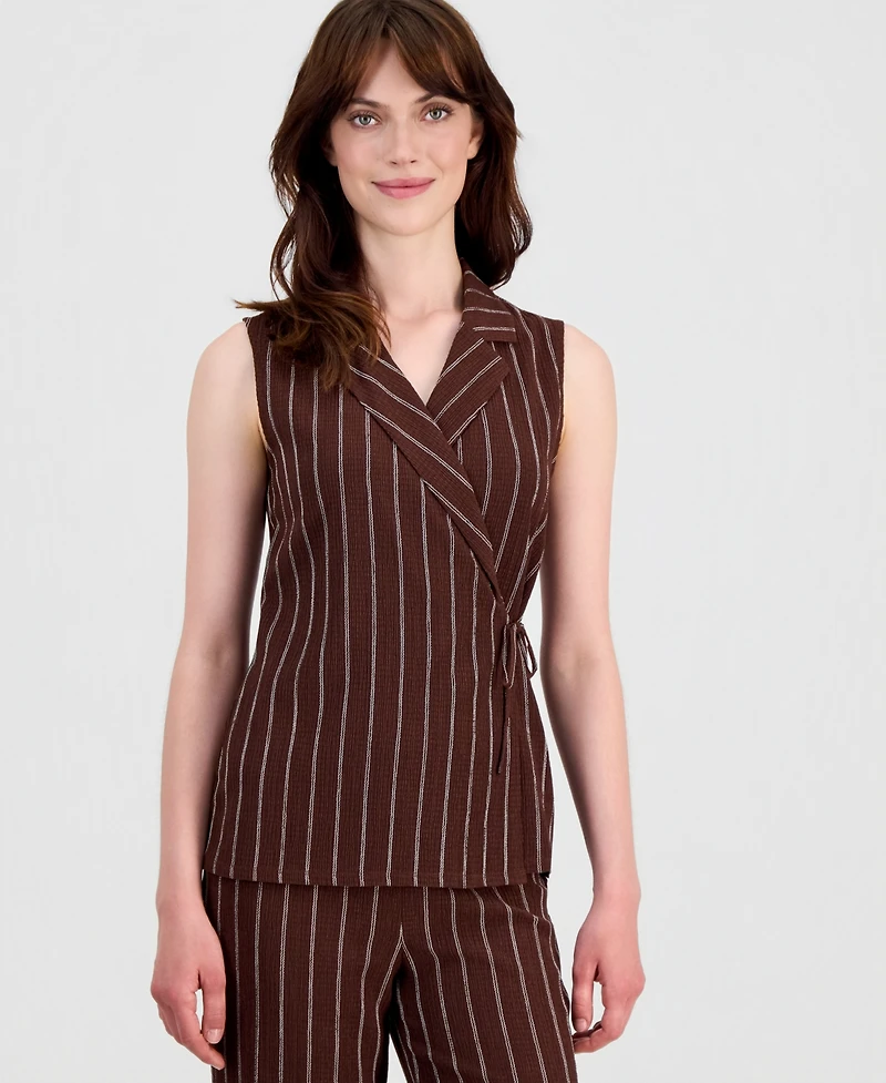 Enjoy tailored ease with this Anne Klein top, featuring a refined notch collar and a sleeveless cut that creates a clean, polished silhouette. The wrap design enhances the shape with a flattering, softly draped effect, adding movement and dimension to the look.