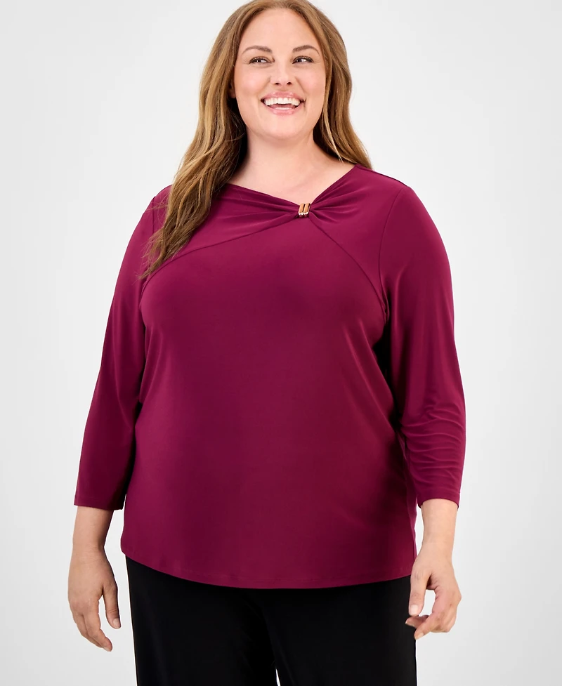 Take your look to the next level in this plus size Anne Klein top, featuring a hardware-embellished twist-front neckline.