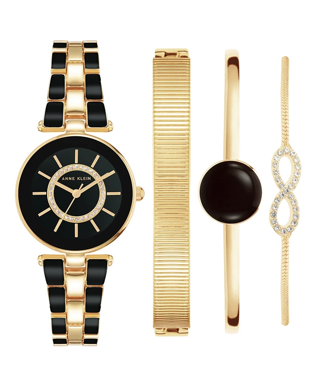 Anne Klein Women's Gold-Tone Alloy Bracelet with Black Enamel and Crystal Accents Fashion Watch 34mm Set 4 Pieces