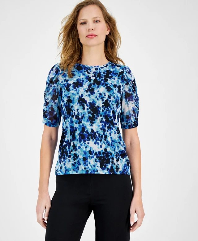 Anne Klein Women's Printed Jewel-Neck Ruched-Sleeve Top