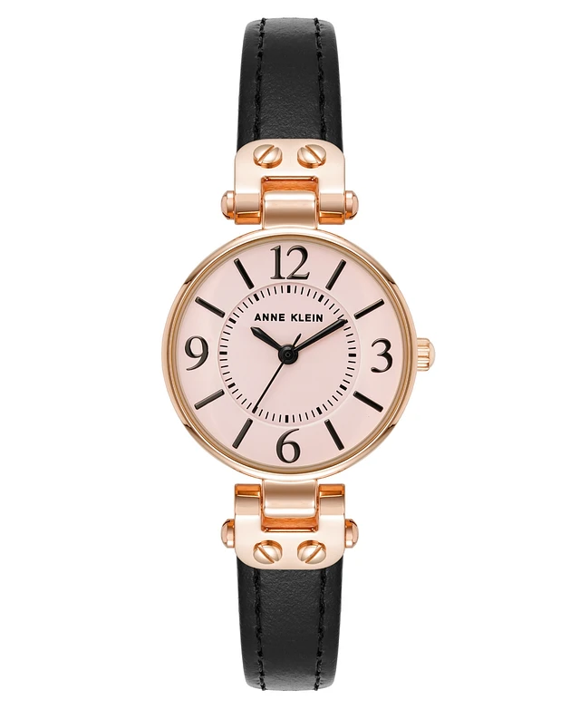 Anne Klein Women's Quartz Black Classic Leather and Rose Gold-Tone Alloy Metal Strap Watch, 28mm