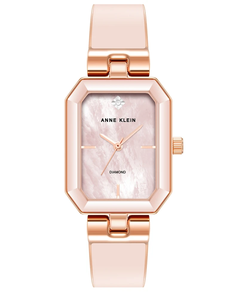 Shapely with a touch of class, this octagon case features a genuine diamond accent; sticks index. The metal band is inlaid with elegant enamel for a truly sophisticated look. Style # Ak-4162BMRG, Ak-4163BKSV, Ak-4162NMRG.