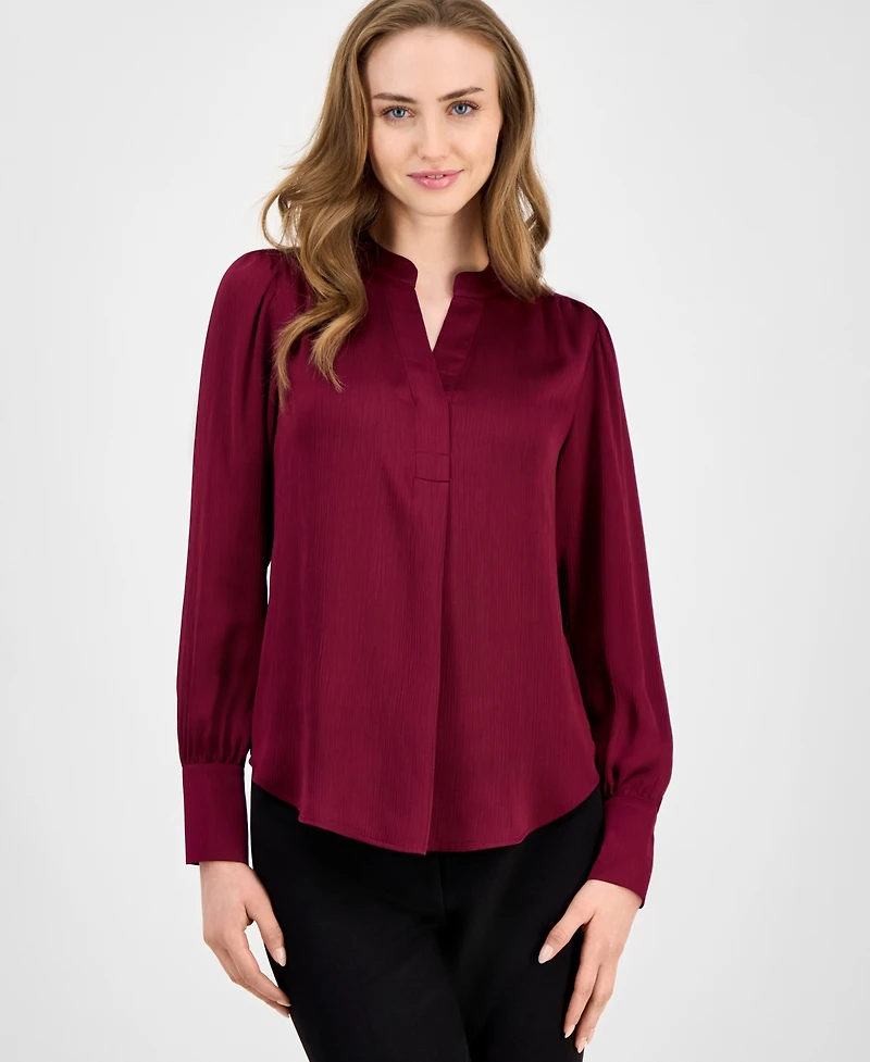 Lend instant polish to your look with this satin blouse from Anne Klein, featuring a pleated front.