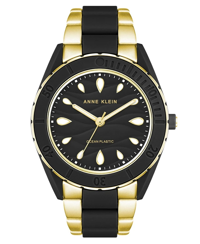 Anne Klein Women's Three-Hand Quartz Gold-Tone and Black Solar Oceanwork Plastic Bracelet Watch, 38.5mm