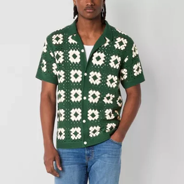 Arizona Mens Short Sleeve Cropped Textured Button-Down Shirt