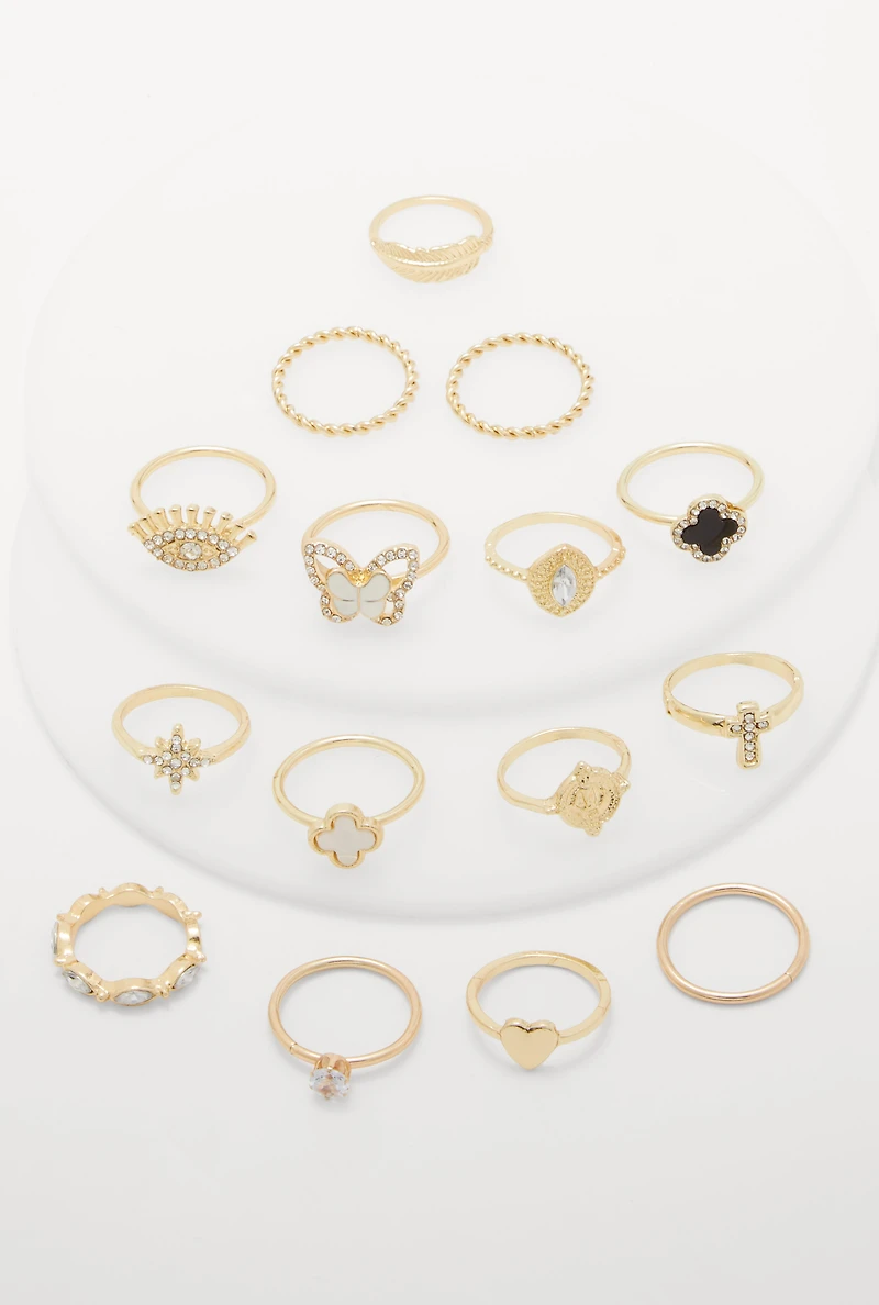 Details and Fit Metallic Rhinestones Solid Ring Size - 7, 8, 9.5, 10 mm Set of 15 Cubic Zirconia Content and Care Material: All Man-Made Material Country Of Origin: China Rainbow Item Number 3138077101001 GOLD - 3138077101001072