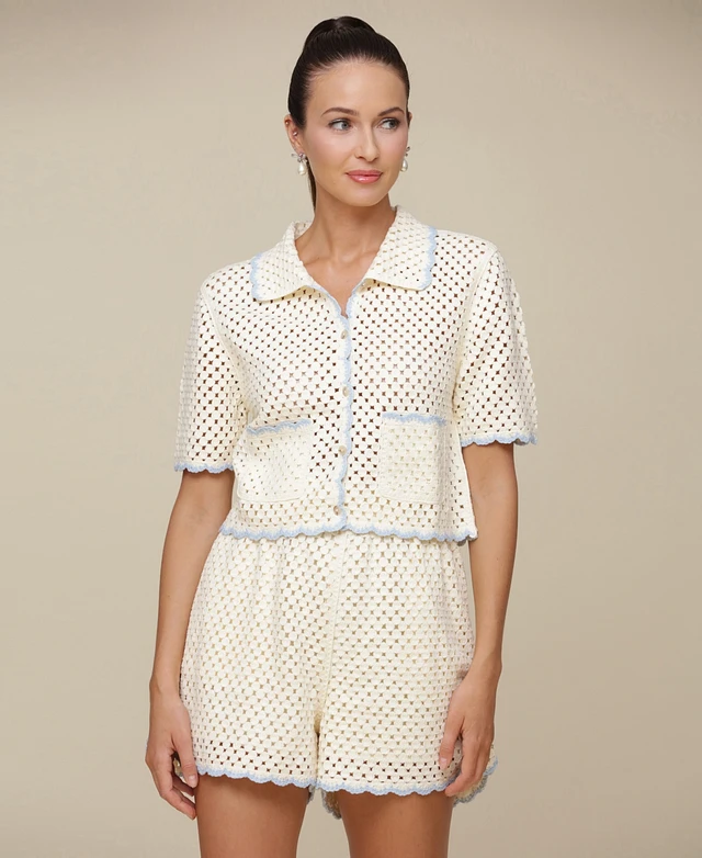 Avec Les Filles Women's Scallop Crochet Short Sleeve Cardigan