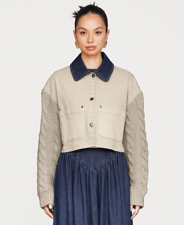 Avec Les Filles Women's Sweater-Sleeve Rinse Wash Denim Chore Jacket