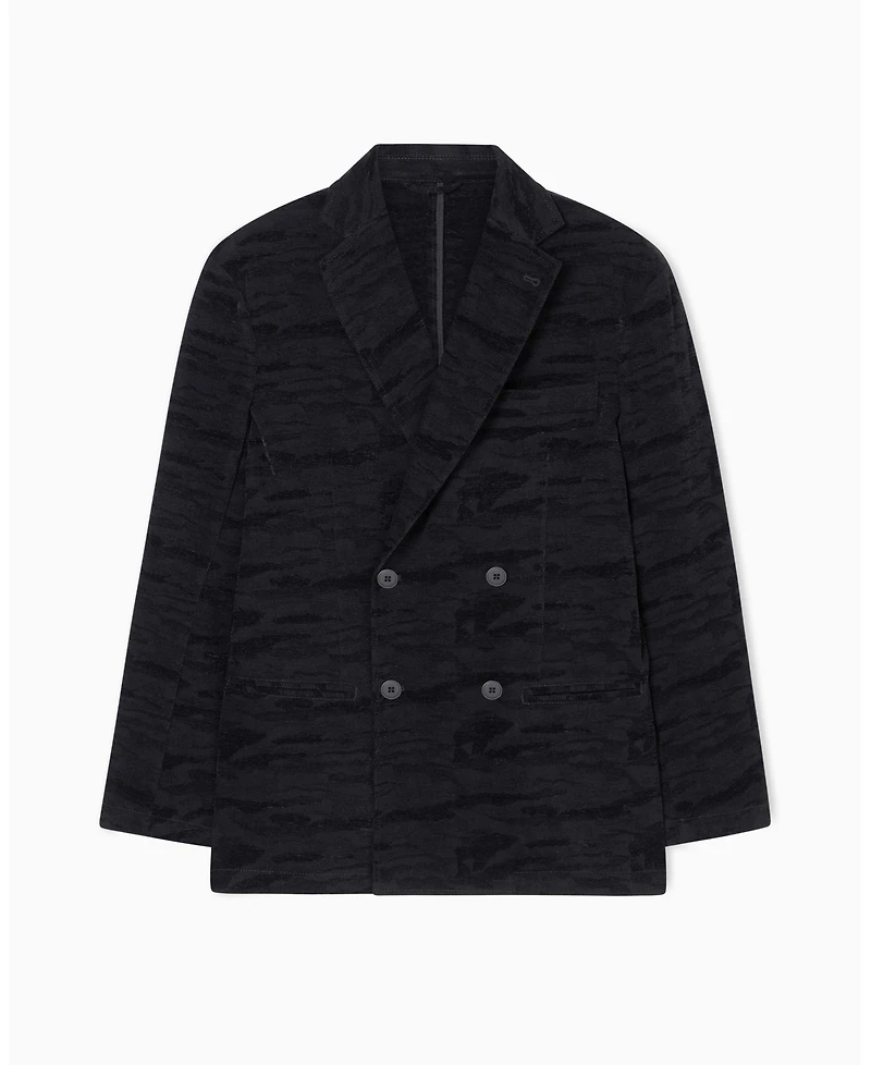 Refine your look with this double-breasted denim blazer, featuring a subtle textured camouflage pattern, peak lapels, and front flap pockets. A versatile piece that blends classic tailoring with modern style-ideal for both formal and smart-casual occasions.