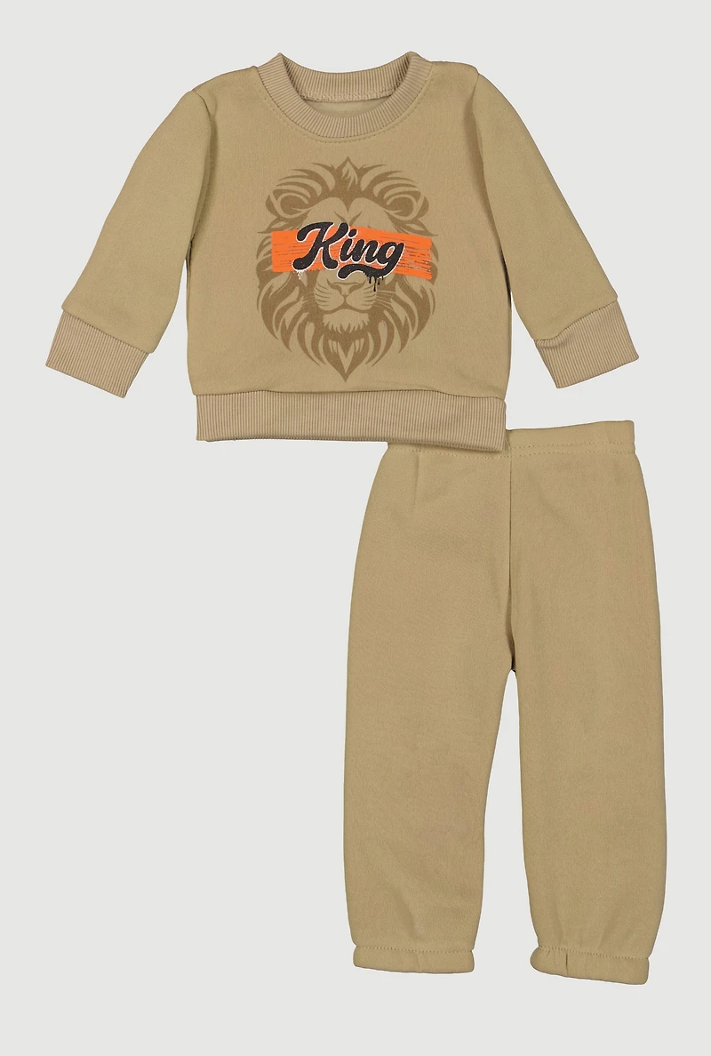 Dress your little one in cozy style with this Baby Boys Lion King Graphic Sweatshirt and Sweatpants set. Perfect for casual days and playtime, this 2-piece outfit features a soft fleece fabric that keeps your baby warm and comfy. The relaxed fit and tapered ankle sweatpants make moving around easy, while the iconic Lion King graphic adds a fun, playful touch that parents and kids will love.