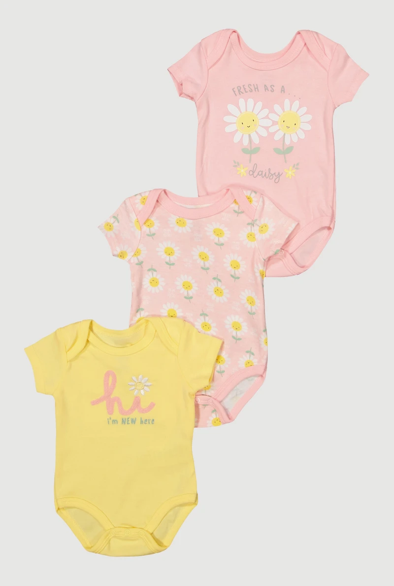 Keep your little one fresh and comfy with this 3 pack of baby girls' graphic bodysuits. Designed for babies 0-9 months, these short sleeve bodysuits feature a classic crew neck and adorable embroidered details that add a cute touch to everyday wear. Perfect for layering or wearing on their own, these bodysuits offer easy bottom snap closures for quick changes, making dressing your baby a breeze.