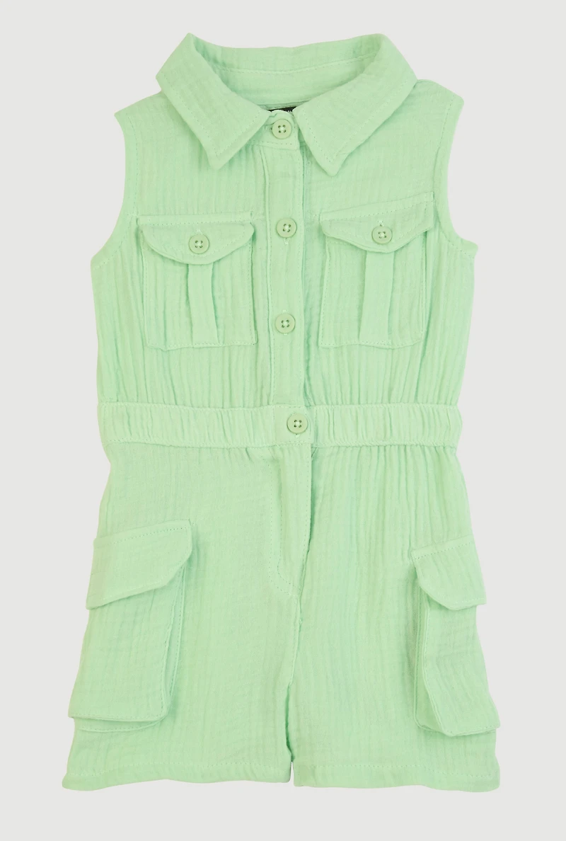 This sleeveless romper for baby girls features a classic collar and a button-front closure for easy dressing. Crafted from soft gauze knit, it offers breathable wear with a relaxed fit. Multiple cargo pockets add playful style and handy storage for little essentials.