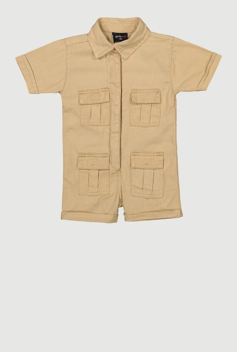 Dress your little adventurer in this baby girls twill mineral wash utility romper, designed for effortless style and comfort. The soft twill fabric features a trendy mineral wash for a cool, lived-in look thats perfect for playdates and everyday fun. With a practical collar and short sleeves, this romper keeps things breezy and cute. Velcro closures make dressing quick and easy, while cargo pockets add a playful, functional touch. Fixed cuffs ensure a neat fit so your baby girl can move freely and comfortably all day long. Soft and durable twill fabric with stylish mineral wash easy-to-use velcro closure for quick dressing functional cargo pockets for added charm and practicality comfortable short sleeves and classic collar design fixed cuffs for a secure, tidy fit during play content and care material: 100% cotton care instructions: machine wash, tumble dry country of origin: bangladesh rainbow item number 1547038348007 khaki - 1547038348007025