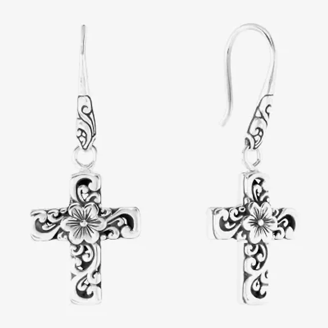 Bali Inspired Womens Sterling Silver Cross Drop Earrings